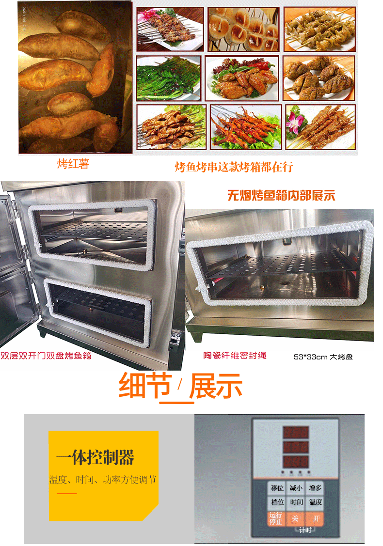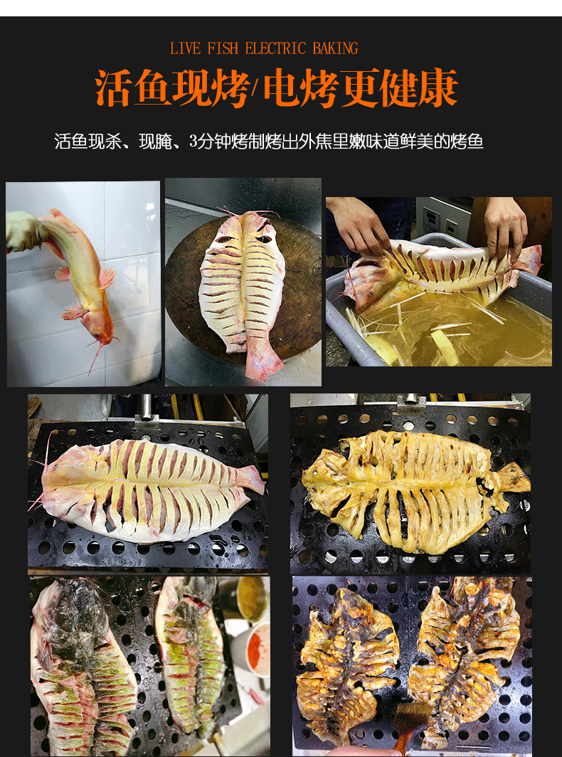 1.減少人工,320度恒溫烤制,避免人工操作的失誤,自動報警系統,減少專門負責烤魚的操作人員/避免人為因素產生的烤制效果